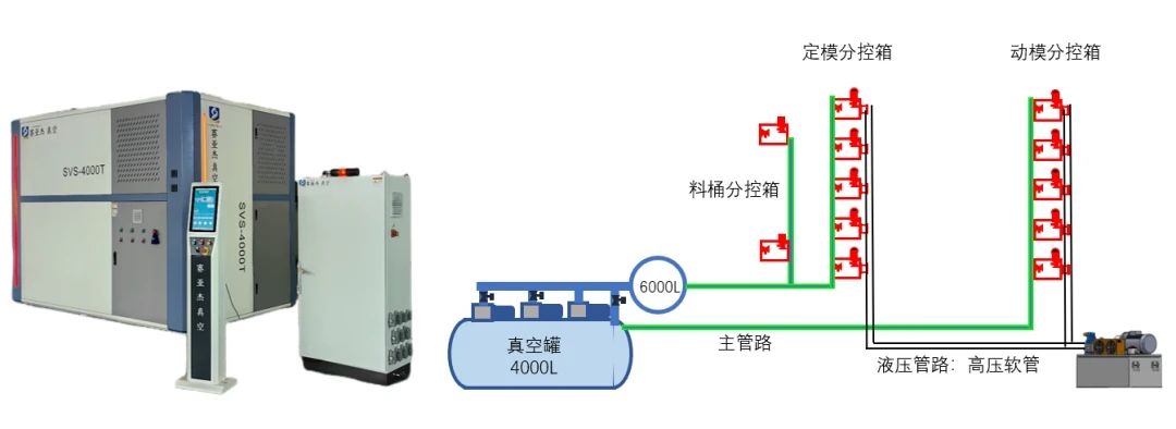 針對SVS系列在超大型一體化壓鑄方面的應用,賽亞杰投入巨資并派遣專業技術團隊進行產品優化開發。目前,已有6000T-20000T及萬噸雙壓射機型成功投放市場。超大型真空系統采用模塊化設計,包括真空泵站、控制系統、液壓系統、分控箱模塊等,可根據客戶需求定制從8組模具抽真空到16組模具抽真空、單壓射料筒抽真空到雙壓射料筒抽真空及頂針室抽真空等多種配置。