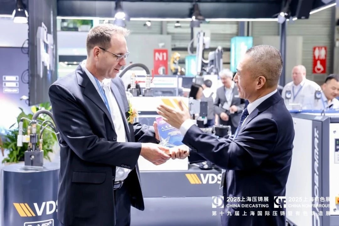 主辦方中國機(jī)械工程學(xué)會鑄造分會劉鴻超秘書長向富來中國 CEO Mr. Rene Hordijk頒發(fā)人氣展臺獎 本屆展會,F(xiàn)RECH富來攜冷室壓鑄機(jī) NATUM4、鋅合金熱室壓鑄機(jī) FCH80Z、ROBAMAT 模溫機(jī)及 VDS 真空系統(tǒng) PLC350 等明星產(chǎn)品閃耀登場。