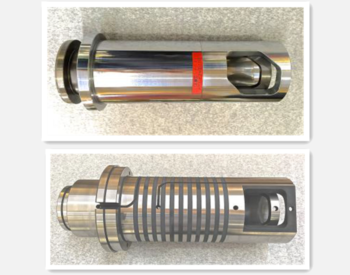 壓室內層(上圖)及裝配好的一體壓室(下圖) 壓室的研究開發部分,在國外,比如在日本,陶瓷壓室已經使用了20、30年。但是,實際上,在國內可能還沒有人去從事這方面的研發和應用工作。為此,我呼吁,類似壓室,以及其他周邊配件和原輔料(如涂料),或者其他各種裝備自動化,等等,都需要我們進一步跟進和研究。