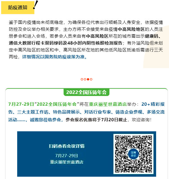 2022年全國壓鑄行業(yè)年會(huì)暨第十七屆中國國際壓鑄會(huì)議將于7月27-29日在重慶麗笙世嘉酒店舉辦。
