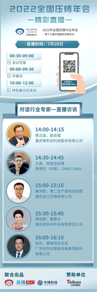 會(huì)議第一天(7月28日),主辦方將聯(lián)合《壓鑄周刊》、中鑄科技開設(shè)“專家訪談”直播間、“特色展示區(qū)現(xiàn)場采訪”,以在線直播形式對話行業(yè)專家及企業(yè)家,深度挖掘行業(yè)痛點(diǎn)與發(fā)展趨勢,敬請關(guān)注!