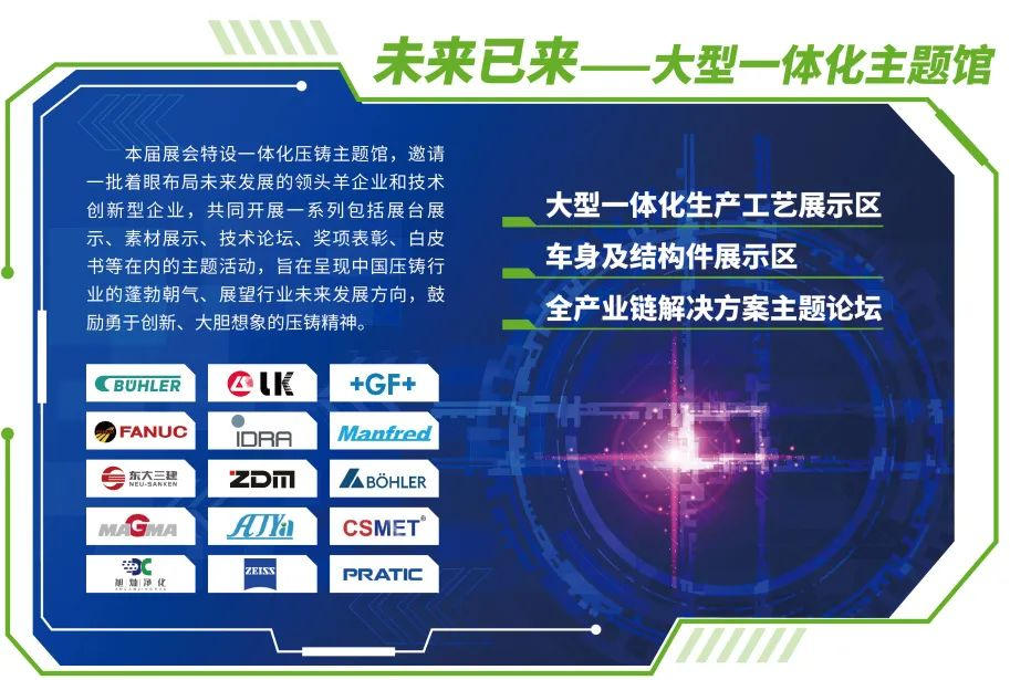 2022年展會全新打造主題館—— “未來已來,大型一體化壓鑄”,涵括了一體化壓鑄技術(shù)及裝備展覽,一體化壓鑄專業(yè)技術(shù)報告演講,一體化壓鑄產(chǎn)業(yè)鏈成果展示。 屆時,壓鑄產(chǎn)業(yè)鏈上下游企業(yè)布勒Buhler、力勁集團、意德拉IDRA、喬治費歇爾GF、帥翼馳、寧波臻至、宜興旭燦、發(fā)那科、東大三建、艾嘉亞、卡爾蔡司、博樂特殊鋼、邁格碼、曼弗萊德等知名企業(yè),將展覽和演示在超大型壓鑄島、免熱處理材料、熔煉給料、超大型壓鑄模具、自動化、模擬仿真、高真空、廢氣處理等方面的先進技術(shù)、裝備及成果解決方案。