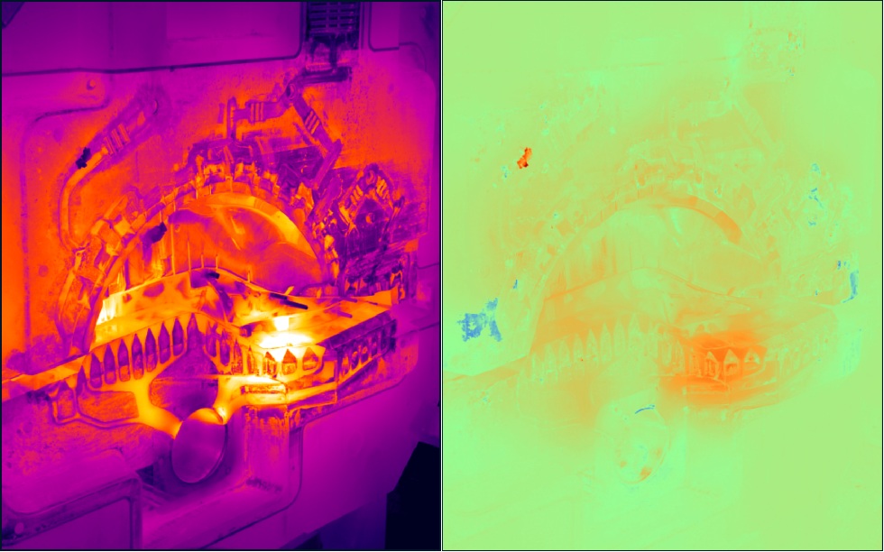 噴涂前 噴涂后 噴涂前后溫度差異 此外,在歷史數(shù)據(jù)查詢分析軟件中,用戶可以任意選擇兩張圖片進(jìn)行溫度對比。 二、模具位置精準(zhǔn)跟蹤功能。考慮到壓鑄車間惡劣的環(huán)境情況,換模觸碰相機(jī)、壓鑄過程振動(dòng)等原因可能導(dǎo)致紅外圖片中預(yù)先設(shè)定的溫度關(guān)注點(diǎn)位置發(fā)生偏移,從而影響模具測溫的穩(wěn)定性。為此,該系統(tǒng)新增了自動(dòng)識別并跟蹤模具位置的功能,確保測溫區(qū)域時(shí)刻準(zhǔn)確。此功能由系統(tǒng)自動(dòng)完成,用戶在無需進(jìn)行任何額外操作的同時(shí),也提升了系統(tǒng)的穩(wěn)定性和可靠性。