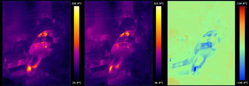 上圖左側(cè)為實(shí)際紅外圖片,右側(cè)為該圖片與標(biāo)準(zhǔn)生產(chǎn)過程的溫度差異圖片,淺綠色代表沒有溫度差異,藍(lán)色區(qū)域代表溫度偏低,紅色區(qū)域代表溫度偏高 根據(jù)噴涂前后溫度變化判斷噴涂效果也是用戶關(guān)心的問題之一。系統(tǒng)會(huì)自動(dòng)對比每次噴涂前后的溫度,并顯示差異圖片。