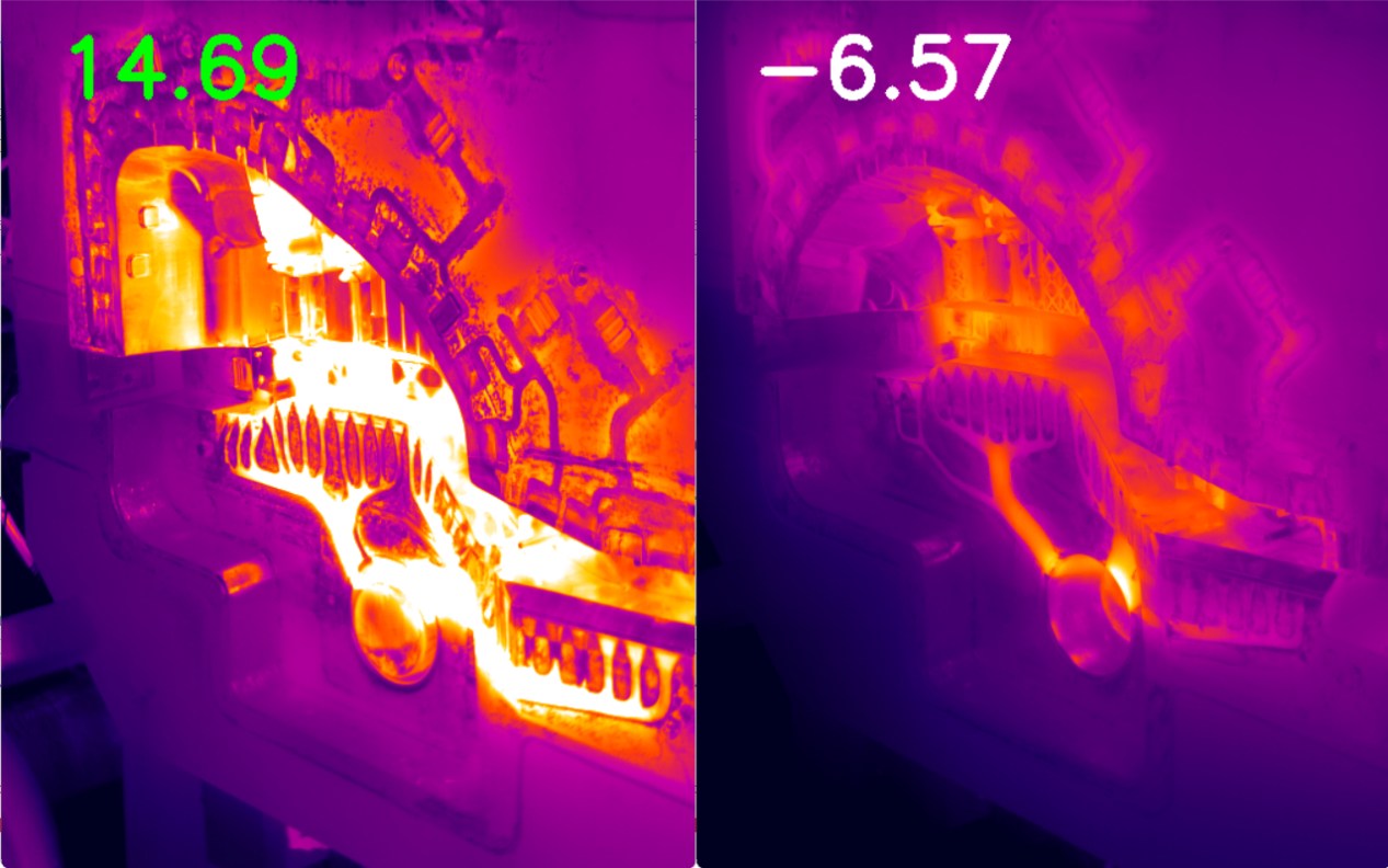 ![]() 模具溫度對壓鑄件質(zhì)量和成品率有著重要影響,因此,對其進(jìn)行監(jiān)控及優(yōu)化以形成良好的模具熱平衡顯得尤為重要。寧波新昱智能科技有限公司開發(fā)的“模具紅外感知系統(tǒng)(MISS)”,通過紅外熱成像相機(jī)實(shí)時(shí)在線監(jiān)測、記錄壓鑄周期內(nèi)關(guān)鍵時(shí)間節(jié)點(diǎn)的模具溫度,并對溫度數(shù)據(jù)進(jìn)行分析處理,感知壓鑄流程中模具和產(chǎn)品溫度狀態(tài)是否正常,實(shí)現(xiàn)生產(chǎn)可追溯,為無瑕生產(chǎn)保駕護(hù)航。 近期,該系統(tǒng)迎來三項(xiàng)重磅功能升級: 一、兩次測溫差異對比。在模具溫度監(jiān)控過程中,用戶往往關(guān)心此次壓鑄過程的溫度是否在合理區(qū)間內(nèi),與正常生產(chǎn)過程相比,哪些位置存在溫度差異。在該系統(tǒng)中,用戶可自定義設(shè)置標(biāo)準(zhǔn)生產(chǎn)過程圖片作為溫度對比的參考依據(jù)。每次進(jìn)行紅外測溫時(shí),系統(tǒng)會(huì)自動(dòng)將當(dāng)前測溫結(jié)果與之進(jìn)行對比,并通過不同顏色來展示溫度差異的大小,使溫度狀態(tài)一目了然。