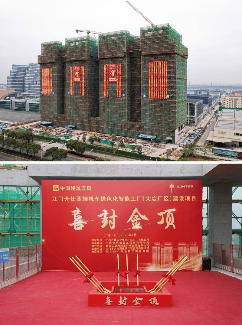 圖源:紅旗研發(fā)新視界 項目團隊以紅旗HDU35混動電驅總成為應用載體,穩(wěn)步推進技術研發(fā)與產品試制,最終成功完成殼體試制與總成裝配。相較于傳統(tǒng)鋁合金方案,該鎂合金殼體單套降重達10公斤,標志著相關技術攻關取得實質性進展。 研發(fā)總院聯(lián)合一汽旗新動力(長春)科技有限公司電驅動開發(fā)部、一汽鑄造有限公司等單位,構建協(xié)同攻關體系,從材料改性、連接工藝、防腐處理等核心技術突破,到產品設計、仿真分析、工藝優(yōu)化,再到壓鑄調試與試制資源保障,材料研發(fā)、產品設計、試制生產、性能試驗及制造落地等各環(huán)節(jié)單位同向發(fā)力,實現(xiàn)了從技術方案構思到產品試制下線的快速跨越。該電驅總成將同步搭載于紅旗在研車型開展路試,旨在打通從技術儲備到整車規(guī)模化應用的周期壁壘,全力推動技術量產落地進程。 大冶摩托“江門升仕新工廠”項目主體結構封頂 據(jù)廣東大冶摩托車技術有限公司(簡稱“大冶摩托”)消息,1月23日,廣東大冶摩托車技術有限公司二期工業(yè)園迎來重要里程碑——江門升仕高端機車綠色化智能工廠(大冶廠區(qū))建設項目主體結構順利封頂,項目建設全面轉入內外裝飾、機電安裝及智慧化系統(tǒng)集成的新階段。