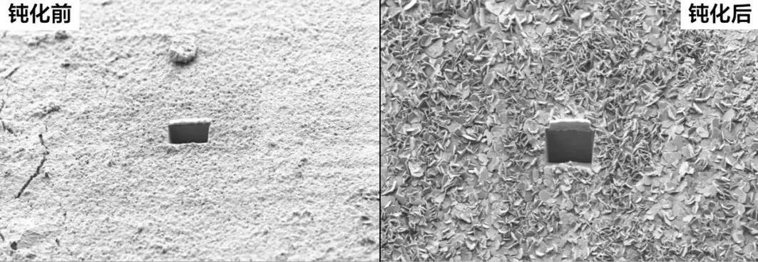 鈍化前后樣品表面微觀形貌 此外,新型藥水pH值呈中性,既避免了對壓鑄件內(nèi)鋼制材料的腐蝕,又降低了對清洗設(shè)備的腐蝕性,使鈍化工序易于整合到壓鑄流水線上。經(jīng)過中試線打樣測試,所獲得的試驗(yàn)結(jié)果完全符合各項(xiàng)標(biāo)準(zhǔn)要求,順利通過驗(yàn)證。