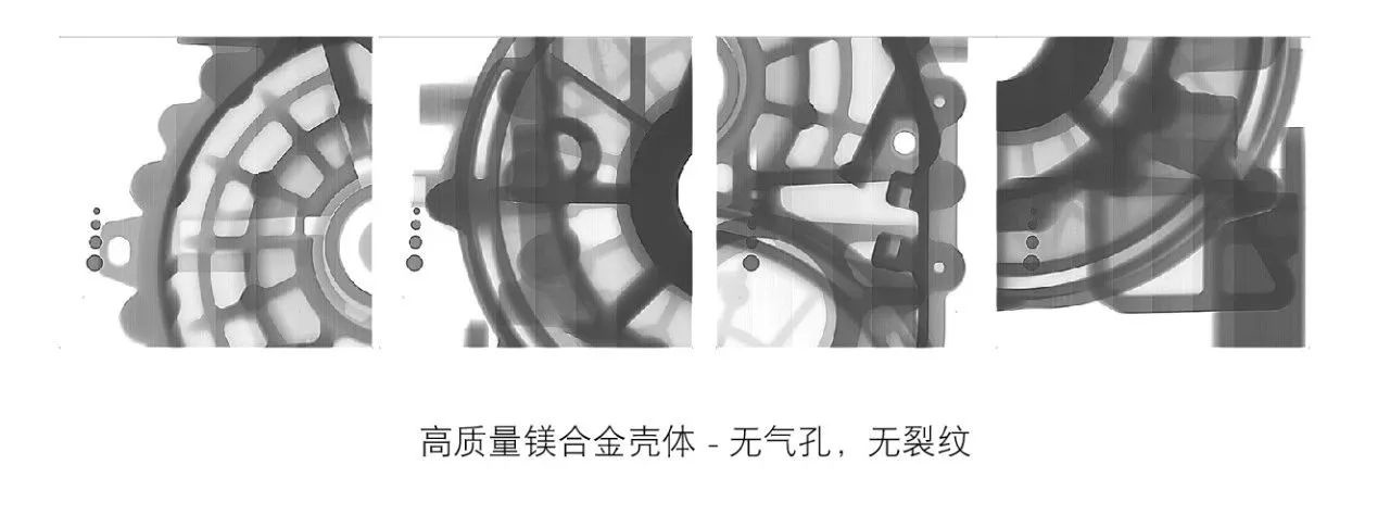 在外觀上,GF中國通過先進(jìn)的模具開發(fā)能力、精確的壓鑄工藝控制,實(shí)現(xiàn)了鎂合金殼體表面比鋁合金殼體表面更亮、更光滑,符合汽車行業(yè)的嚴(yán)格外觀標(biāo)準(zhǔn)。測試發(fā)現(xiàn):GF中國試制的鎂合金殼體展現(xiàn)出了優(yōu)異的內(nèi)部質(zhì)量,尤其是產(chǎn)品厚大位置及關(guān)鍵加工區(qū)域內(nèi)部質(zhì)量優(yōu)于鋁合金殼體。在加工后的油水路泄露測試環(huán)節(jié),GF中國試制的鎂合金殼體同樣表現(xiàn)優(yōu)異,泄露測試通過率達(dá)到100%,確保了殼體在各種工況下都能保持良好的密封性。