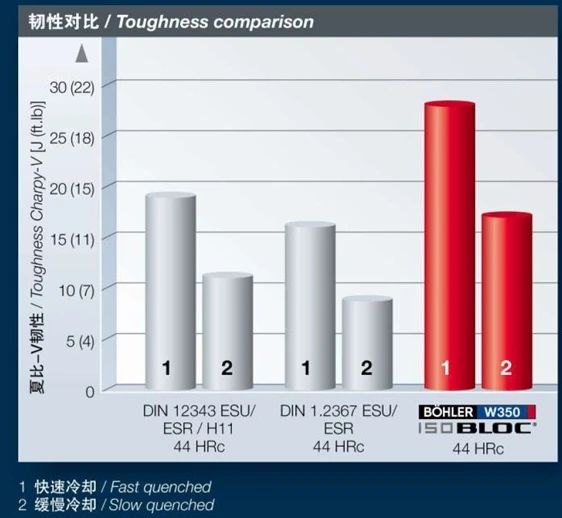 DIN 1.234ESU/ESR/H11,DIN1.2367ESU/ESR,Bohler W350IB HRC44 快速冷卻和慢速冷卻V型槽韌性比較
