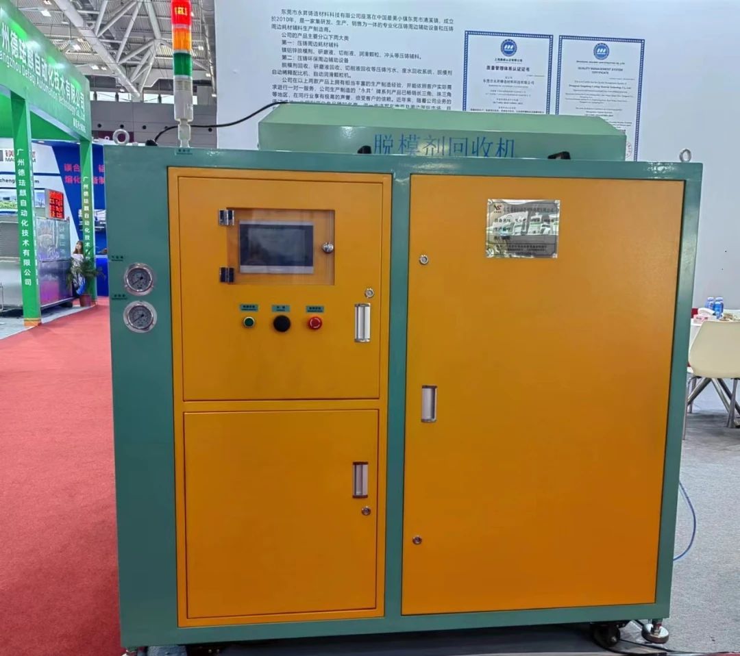 永昇新款顆粒機(jī)(左)、柱塞油機(jī)(右) 目前,永昇科技已形成自動(dòng)潤(rùn)滑顆粒機(jī)、壓鑄專用脫模劑、脫模劑回收機(jī)、脫模劑配比機(jī)四大主營(yíng)產(chǎn)品。據(jù)了解,永昇自動(dòng)潤(rùn)滑顆粒機(jī)可自動(dòng)分配潤(rùn)滑顆粒油進(jìn)入冷室壓鑄機(jī)的料管,改善柱塞頭與料管之間潤(rùn)滑效果,并可增強(qiáng)鑄件的脫模性,避免造成鑄件因柱塞油所形成的氣孔;壓鑄專用脫模劑,可有效地減少壓鑄件因高溫產(chǎn)生粘模、起泡、熱裂和燒傷的缺陷,延長(zhǎng)模具的使用壽命。