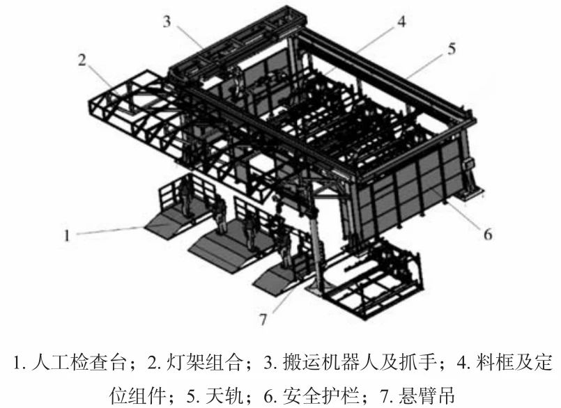 圖15為產品在AGV上的示意圖。通過機器人將產品放在AGV小車上,小車識別到有產品后,搬運產品到人工檢查工位(圖16);人工對產品外觀進行100%檢查,檢查后輸入合格和不合格信息,信息傳遞到自動化裝箱站。機器人根據產品信息將產品放入合格品或不合格品的料架,實現了自動裝箱。當裝箱站的料架裝滿產品后,自動化裝箱站呼叫新的AGV進入自動化裝箱站,更換新的料架。整個過程自動化完成,減少人工搬運,提高效率。