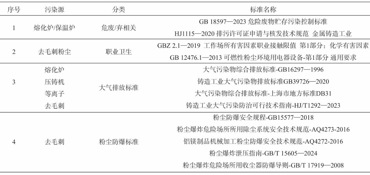 壓鑄島及周邊環境保護方面的要求,如表2壓鑄專業涉及標準匯總所示,其中包含危廢/棄物相關、職業衛生、通用標準、大氣排放標準、大氣污染防治技術和粉塵防爆標準等多個方面。這些規定由國家和地區的法律法規執法部門規定,依據地方法規有差異,實施壓鑄島規劃前需詳細了解地方環境保護規定。