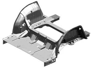 圖2為一體化壓鑄后車身簡圖,基本外形尺寸1 600 mm×1 450 mm×800 mm,采用自研材料HA1-H壓鑄鋁合金材料,質量54.5 kg。由于產品尺寸和質量大,產品的搬運困難。因此,壓鑄島的設計要盡可能減少搬運。圖3為設計的工藝流程圖,為了減少搬運過程,所有的加工都在壓鑄島內完成,鋁錠的投料采用移動機器人小車(以下簡稱AGV)以降低勞動強度。