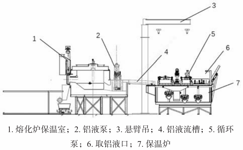 大型一體化壓鑄帶澆注系統質量約為82 kg,按90 s節拍計算,每小時鋁液消耗量為3.28 t,為了保證產能的穩定性,選擇4 t/h熔化能力的熔化爐。為了保證保溫爐溫度的穩定性,選擇10 t保溫爐。如圖5所示,鋁液熔化后,通過鋁液泵將鋁液運輸到保溫爐中,保溫爐下方也通過透氣磚通入氬氣,讓鋁液中的氫氣溢出,同時保溫爐也設計循環泵,保證鋁液的密度指數小于2%。同時也避免了傳統保溫爐通過叉車轉運鋁液,大大降低了勞動強度,提升了效率。