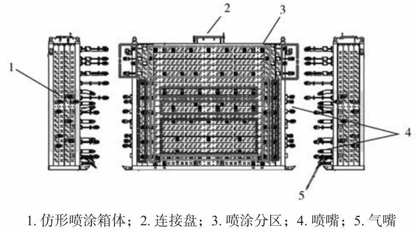 同時,配比機采用多個脫模劑混合箱,可以實現不同濃度配比,結合工裝的多回路控制,不僅實現了分區時間控制,也實現了分區濃度控制,特別有利于深腔的位置;結合大型壓鑄機的開模距離比較大,6 000 t以上壓鑄機開模距離在2 000 mm以上,這樣就有足夠的空間在動定模設計噴涂,可以實現動定模同時噴涂,大幅縮短了噴涂時間。