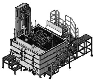 由于產品質量較大,采用傳統的風冷方式,需要更多的時間且占用空間大,因此,大型一體壓鑄零件冷卻必須采用水冷,這樣效率更高。可以在30 s以內將產品的溫度降低在70 ℃以下,為后工序的產品尺寸穩定性提供了保障。水箱的材質采用304不銹鋼,可以避免后續使用時生銹。水溫控制在50 ℃左右。如圖8所示,水冷工裝采用浮球加緊工裝,借助水的浮力,在升降過程中,零件定位更穩定,速度更快,生產效率更高。