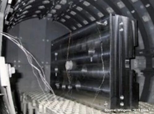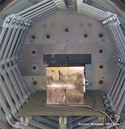圖3. 通用汽車動力總成16英寸立方體淬火試驗 大型一體化壓鑄模的熱處理挑戰(zhàn) 大型H13鋁壓鑄模具的熱處理傳統(tǒng)上需要在保證足夠淬火速率以獲得良好機械性能的同時,兼顧控制變形與開裂風(fēng)險之間的平衡。隨著現(xiàn)代汽車及工業(yè)應(yīng)用對更大尺寸壓鑄件的需求日益增長,冶金學(xué)家與設(shè)備供應(yīng)商正聚焦于以下幾個關(guān)鍵發(fā)展方向:在高壓真空爐中實現(xiàn)更快速的淬火技術(shù);采用中斷淬火與等溫控制工藝;以及開發(fā)可應(yīng)對重載荷與高熱負(fù)荷的輔助系統(tǒng)。