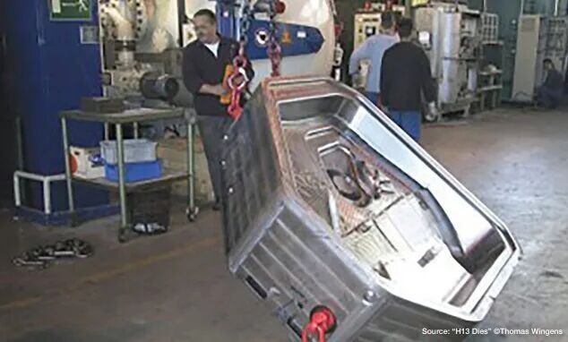 圖6. 德國汽車行業(yè)加工的6噸H13模具,為當(dāng)時(2004年)全球最大 遵守 NADCA 建議:盡管模具尺寸存在差異,NADCA #207 中針對H13壓鑄模具的熱處理基本原則仍然適用。其中,在關(guān)鍵溫度區(qū)間內(nèi)實現(xiàn)最低50°F/min(約28°C/min)的表面冷卻速率,仍是核心工藝目標(biāo)之一。為此,具備高回填能力的真空爐是首選。 精確的溫度控制:現(xiàn)代真空爐配備有先進的數(shù)控系統(tǒng)與多熱電偶監(jiān)測裝置,可實時追蹤并調(diào)整溫度曲線,從而確保模具均勻加熱至奧氏體化溫度(H13鋼通常約為1885°F/1030°C),并在淬火及回火過程中實現(xiàn)精確工藝控制。