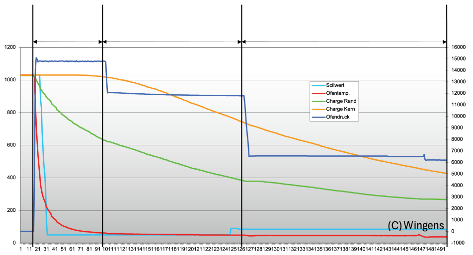 圖7. 淬火壓力15bar,電機運行至870千瓦(約1170馬力)并逐步降壓 回火:在快速淬火處理后,需進行至少兩次回火操作,且每次回火后均應(yīng)冷卻至室溫。通常還會增加一次最終去應(yīng)力回火,以消除工件中的殘余應(yīng)力。 材料科學(xué)的影響:雖然熱處理工藝對模具性能至關(guān)重要,但選用高質(zhì)量的模具鋼材同樣不可或缺。大型一體化壓鑄模具通常采用優(yōu)質(zhì)或特級H13鋼,根據(jù)NADCA #207標(biāo)準(zhǔn),這類鋼材需嚴(yán)格滿足潔凈度、帶狀組織及沖擊韌性等方面的要求。 當(dāng)前持續(xù)的研究正致力于開發(fā)性能更優(yōu)異的模具鋼,例如Dievar與QRO-90等材料,而合理的熱處理工藝仍是充分發(fā)揮這類先進模具鋼性能潛力的關(guān)鍵所在。 未來趨勢與展望 大型一體化壓鑄模具的熱處理技術(shù)正處于持續(xù)發(fā)展之中,以滿足汽車行業(yè)日益提升的性能與效率需求。未來的發(fā)展趨勢和重點關(guān)注方向包括: 規(guī)范修訂與適配:北美壓鑄協(xié)會(NADCA)正在評估現(xiàn)行#207規(guī)范對超大型模具的適用性,旨在更有效地應(yīng)對大型模具在檢測方法、質(zhì)量保證體系以及整體性能允許偏差范圍等方面帶來的獨特挑戰(zhàn)。 先進過程控制:熱處理模擬與有限元分析(FEM)日益廣泛地用于預(yù)測并優(yōu)化淬火工藝過程,包括對熱梯度的精準(zhǔn)預(yù)估與補償控制。 創(chuàng)新熱處理工藝:諸如馬氏體等溫淬火等新型技術(shù)正在研究中,其作為傳統(tǒng)淬火-回火體系的潛在替代方案,能夠在更短工藝周期內(nèi)實現(xiàn)高硬度與高韌性的綜合性能平衡。 能源效率提升:行業(yè)致力于降低高壓氣淬工藝的能耗,重點通過優(yōu)化真空爐結(jié)構(gòu)設(shè)計及升級控制系統(tǒng)以實現(xiàn)更高效的能源利用。 與工業(yè)4.0/5.0的融合:數(shù)字化與自動化技術(shù)有望推動熱處理工藝的革新,在提升生產(chǎn)效率、優(yōu)化產(chǎn)品質(zhì)量及簡化生產(chǎn)流程方面發(fā)揮關(guān)鍵作用。