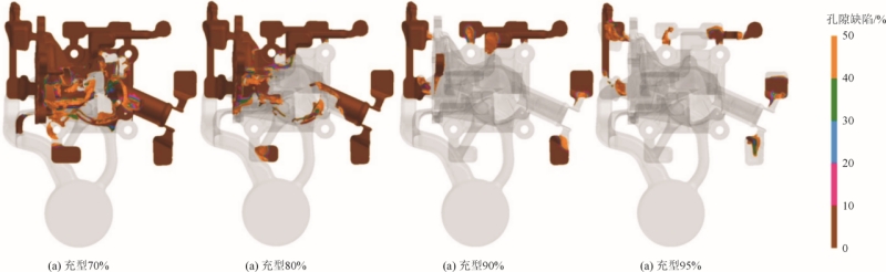 圖8 活塞運動速度與時間關系圖 用模流軟件中的void預測模型充型過程中易出現裹氣的部位,見圖9。可以看出,當鑄件充型70%時最開始填充離內澆口最近的碗形深腔頂部,而在充型80%的時候,深腔頂部和3個圓孔基本充滿,說明充滿深腔頂部的金屬液流速很快,這不利于內部收縮甚至產生縮孔。鑄件充型90%時,除溢流槽和一側邊圓孔外,鑄件內部已經充填完畢,而在充型95%時,只有溢流槽部分未充滿,表明側邊單一圓孔金屬液填充速度過快,容易出現縮孔缺陷。圖10為兩種冷卻水道的鑄件凝固30%時溫度場及溫度趨勢。可見傳統冷卻水道的碗狀深腔溫度約為570℃,而帶有隨形冷卻水道效果更優,深腔邊緣溫度約為540℃,頂部為557℃,在型腔內部能夠避免熱節處出現孤立液相區導致無法補縮的問題,進而避免縮松縮孔缺陷的發生。 圖11為帶有傳統冷卻水道和隨形冷卻水道模具充型凝固完成后的溫度場,將其沿著XY、XZ方向切片,對比模具溫度變化。從沿著XZ切片圖可以看出,在深腔頂部左外表面上和深腔內部溫度隨形水道的冷卻效果優于傳統水道。隨形冷卻水道左表面溫度梯度由少部分溫度區間226.7~268℃轉變為大部分,且深腔內部268.0~309.3℃的溫度呈降低趨勢。圖12為深腔最終凝固時間分布圖。