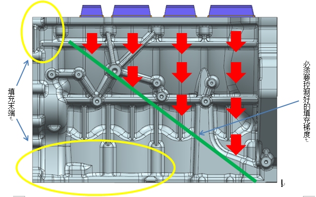 3.通過以上對比,很顯然可以得出的結論:無論是從產品鑄造質量或模具壽命,雙側進料都要優與單側進料;單側進料由于受限于產品本身結構是無法改變的,而雙側進料只需要解決此種狀態下的排氣問題即可。 三、缸體雙側進料澆排系統的設計要點: 1.填充順序的控制:要解決排氣問題首先需要考慮的是各個內澆口從前端到末端的填充順序,從第一個內澆口入料開始到最后一個內澆口入料必須是有一個明顯梯度的順序填充,如下圖所示: