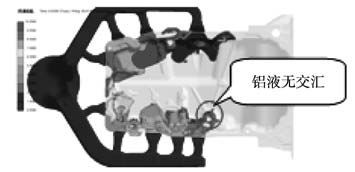 圖7 壓室充型模擬結果 依據模擬結果顯示,鋁合金液在壓室內溫度始終保持在液相線+30 ℃以上,且低速充型過程中,隨著沖頭向前推進,鋁液充型平穩,無卷氣現象產生,避免了壓室內氣體的卷入。 3.2 快壓射速度的選擇 快壓射速度選擇的原則:(1)鋁合金液在充滿型腔前必須具有良好的流動性,保證充型的順暢;(2)使鋁合金液能快速有序地充滿型腔,并把氣體排出到型腔外;(3)不形成高速的金屬流沖刷型腔或型芯,避免粘模現象的產生,鋁合金壓鑄件內澆道速度一般為40~60 m/s。油底殼鑄件內澆道總截面積為771mm²,壓室截面積為9498.5mm²,初步選定內澆道速度為50m/s ,依據伯努利方程:內澆道速度×內澆道截面積=高速速度×壓室截面積,計算得出高速速度為4m/s。 3.3 高速切換位置的選擇 壓鑄件理論高速切換位置為金屬液填充至內澆道位置,該油底殼鑄件理論高速位置為590 mm,但由于內澆道為上下排列,底部的內澆道會提早進料,導致鑄件底部位置出現冷隔問題,故將高速切換點設置為550 mm,具體壓鑄工藝參數見表1。