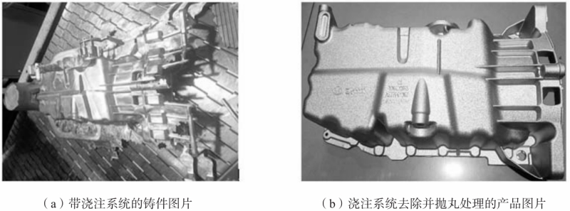 圖2 局部厚大位置剖視圖 由于該油底殼內腔為產品頂出位置,因此內腔以動模成形,方便產品頂出,減小包緊力的作用,從而保證產品的平面度;且濾清器安裝面、放油螺栓孔及后端面為3組滑塊所在位置,如圖1(b)。故依據該油底殼結構選定分型及進料方式如圖3所示:整體進料方式為豎直進料,以油底殼前端面為進料位置,可以避免分流錐設置在滑塊上容易卡死的風險。共設計10組內澆道進料,后端面為填充末端。對該澆注系統進行初始數值模擬,模擬結果顯示,鑄件充型完成時整體溫度偏低,如圖4所示。原因為澆注系統流程長,充型過程中熱量損失大,充型末端容易形成冷料聚集,從而導致加工后氣孔、夾渣缺陷增多。且底部兩股流道優先進料,容易形成冷隔,導致拋丸后起皮,如圖5所示。