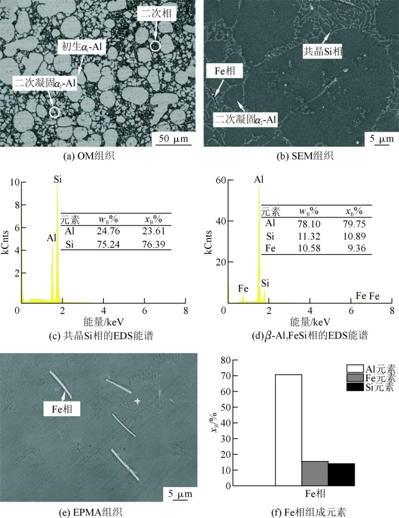 圖1 半固態(tài)壓鑄Al-Si-Fe-Mg合金的顯微組織、EDS分析EPMA和Fe含量