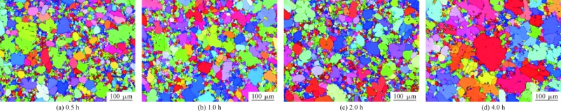 圖2 不同固溶時間下半固態(tài)壓鑄Al-Si-Fe-Mg合金的EBSD結(jié)果