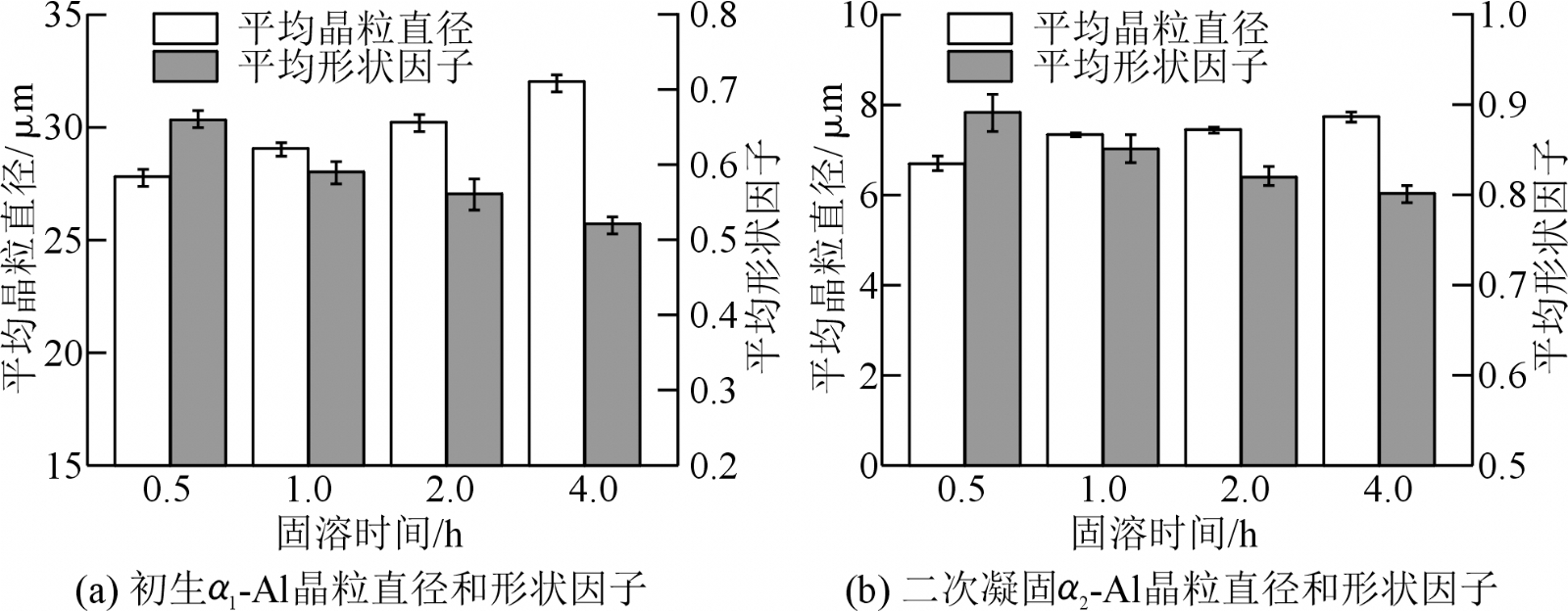 圖1為半固態(tài)壓鑄Al-Si-Fe-Mg合金的顯微組織、EDS分析、EPMA組織及Fe含量。 圖2為不同固溶時間處理的半固態(tài)壓鑄Al-Si-Fe-Mg合金的EBSD組織。可以看出,不同固溶時間處理的合金組織中的α-Al晶粒均由大尺寸的初生α1-Al晶粒和小尺寸的二次凝固α2-Al晶粒組成。基于EBSD結(jié)果,對初生α1-Al晶粒和二次凝固α2-Al晶粒的直徑和形狀因子進行統(tǒng)計,見圖3。