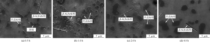 圖4 不同固溶時間下半固態(tài)壓鑄Al-Si-Fe-Mg合金的SEM組織