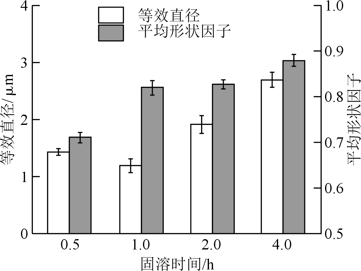 圖3 固溶時間對半固態(tài)壓鑄Al-Si-Fe-Mg合金顯微組織的影響 圖4為固溶處理后半固態(tài)壓鑄Al-Si-Fe-Mg合金的SEM組織。可以看出,當固溶時間為0.5 h時,共晶Si相由短棒狀以及顆粒狀共晶Si相組成,共晶Si相出現(xiàn)頸縮現(xiàn)象,頸縮的共晶Si相發(fā)生溶斷并破碎成小的共晶Si相,見圖4a。當固溶時間增加至1 h時,共晶Si相為顆粒狀形貌,見圖4b。隨著固溶時間繼續(xù)增加,顆粒狀共晶Si相長大,見圖4c和圖4d。對比共晶Si相的等效直徑和形狀因子發(fā)現(xiàn),當固溶時間從0.5 h增加至4 h時,共晶Si相的等效直徑先減小后增加,形狀因子持續(xù)增大,見圖5。