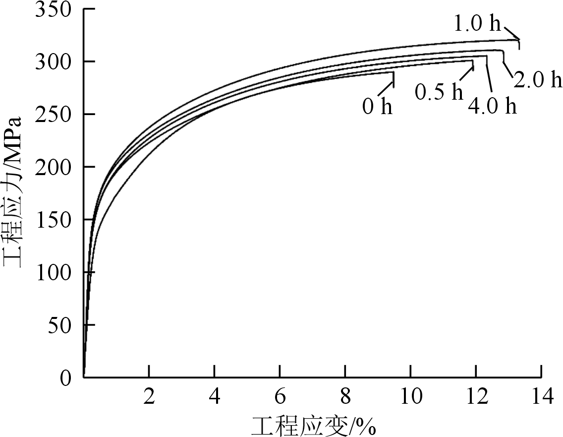 圖5 不同固溶時間處理對合金中共晶Si相的等效直徑和形狀因子的影響 圖6為不同固溶時間下半固態(tài)壓鑄Al-Si-Fe-Mg合金的EPMA組織。基體中溶質(zhì)原子的固溶度分析結(jié)果見表2。結(jié)果表明,當固溶時間為0.5 h時,部分Si和Mg元素溶于基體,Cu元素幾乎完全溶于基體。隨著固溶時間延長至1 h時,Si和Mg元素在基體中的固溶度增加。隨著固溶時間繼續(xù)延長,Si和Mg元素在基體中的固溶度保持不變。 圖7為不同固溶時間下半固態(tài)壓鑄Al-Si-Fe-Mg合金的工程應(yīng)力-應(yīng)變曲線。可以發(fā)現(xiàn),隨著固溶時間從0 h延長至4 h,合金的抗拉強度、屈服強度和伸長率均先增加后降低。當固溶時間為1 h時,合金的力學性能最優(yōu),其抗拉強度、屈服強度和伸長率分別為320.1 MPa、224.2 MPa和13.3%。
