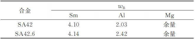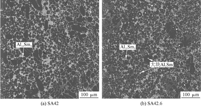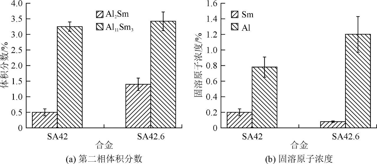 圖2為SA42和SA42.6合金的微觀組織。可以看出,兩種合金的微觀組織均呈現(xiàn)細(xì)小等軸晶,晶界周圍分布著棒狀的Al11Sm3相,晶粒內(nèi)部少量分布著塊狀A(yù)l2Sm相。圖3為SA42與SA42.6合金的第二相體積分?jǐn)?shù)和固溶原子濃度。可以看出,SA42.6合金的晶粒尺寸為8.2 μm,略小于SA42合金的晶粒尺寸(9.1 μm);SA42.6合金的晶粒內(nèi)部含有更多尺寸>2 μm的Al2Sm顆粒,而SA42合金的晶粒內(nèi)部的Al2Sm顆粒更細(xì)小,并未完全長大。由圖3b可以發(fā)現(xiàn),SA42合金中Sm的固溶原子濃度較SA42.6合金中的高。