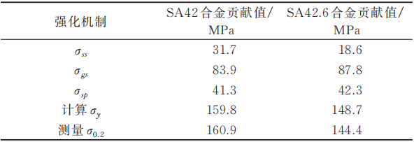 圖6 SA42與SA42.6合金的第二相強(qiáng)化效果 表3 SA42與SA42.6合金的不同強(qiáng)化效果