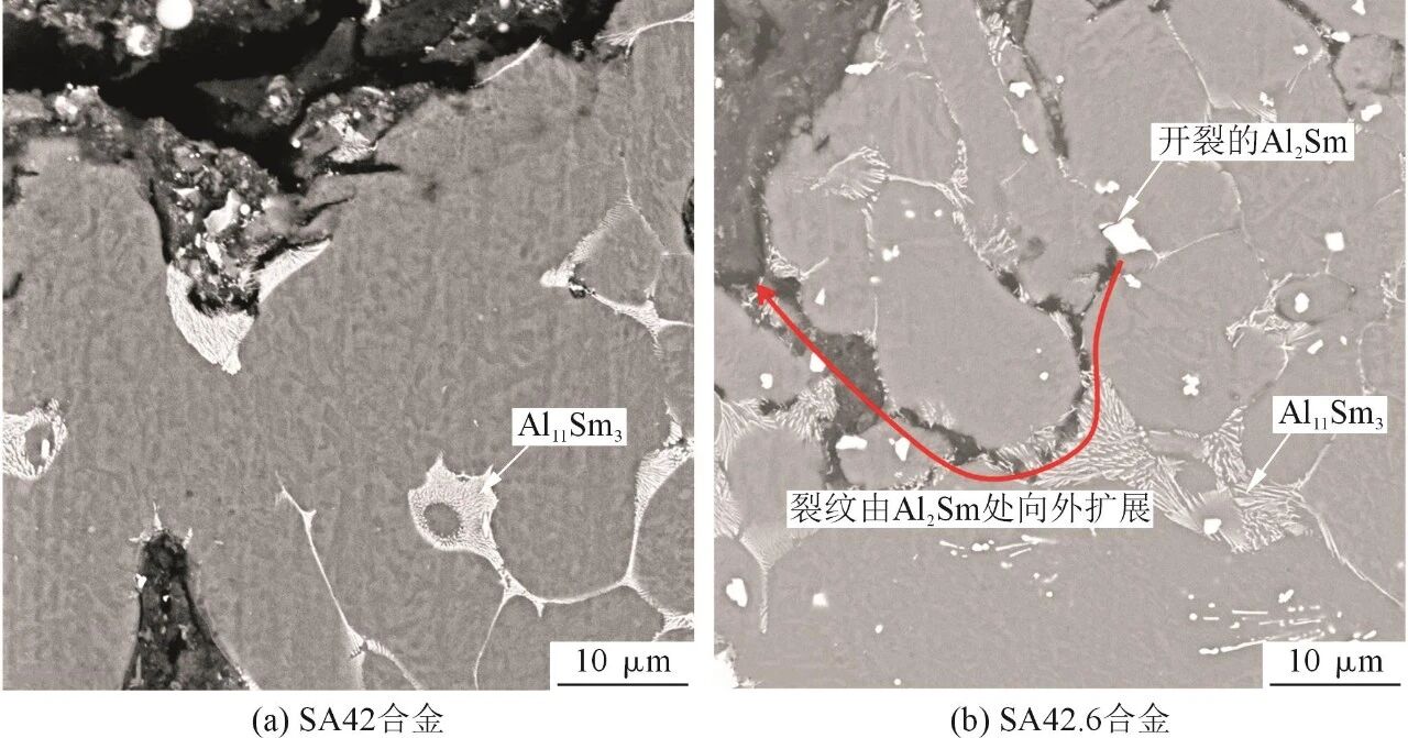 由圖4可知,在SA42合金的基礎(chǔ)上增加0.6%的Al,塑性顯著降低,伸長率降低了63.5%。圖7為SA42合金和SA42.6合金斷口附近縱截面的形貌。可以看出,SA42合金的裂紋既有穿晶斷裂又有沿晶斷裂,但穿晶斷裂較多。而SA42.6合金由于存在大量大塊的Al2Sm顆粒,Al2Sm顆粒的彈性模量(143.95 GPa)比Al11Sm3相的彈性模量(102.25 GPa)高,Al2Sm更脆且更硬。所以在Al2Sm顆粒上很容易產(chǎn)生應(yīng)力集中,導(dǎo)致Al2Sm開裂,裂紋順著Al2Sm顆粒與鎂基體的界面擴(kuò)展,隨后進(jìn)一步從晶粒內(nèi)部穿越,擴(kuò)展到晶界,最終導(dǎo)致試樣斷裂(見圖7b中曲線)。