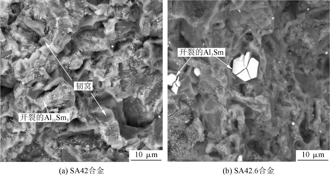 圖8 兩種合金斷口表面形貌 結(jié)論 (1)SA42合金中增加0.6%的Al后,SA42.6合金中形成了大量的大塊Al2Sm相,導(dǎo)致壓鑄SA42.6合金基體內(nèi)固溶的Sm含量降低了近50%。 (2)增加0.6%的Al后,SA42.6合金固溶強(qiáng)化效果大幅降低,形成的Al2Sm相強(qiáng)化效果弱,異質(zhì)形核效果也較差,產(chǎn)生的第二相強(qiáng)化和晶界強(qiáng)化無法彌補(bǔ)固溶強(qiáng)化效果的缺失,導(dǎo)致壓鑄SA42.6合金的屈服強(qiáng)度比SA42合金的降低了近20 MPa。 (3)增加0.6%的Al后,SA42.6合金塑性急劇惡化,伸長率降低了63.5%。這主要?dú)w因于Al2Sm顆粒與基體的模量不匹配,Al2Sm顆粒較脆較硬,在變形過程中產(chǎn)生了較大的應(yīng)力集中,加速了合金的斷裂失效。 《微量Al變化對壓鑄Mg-4Sm-2Al合金組織和力學(xué)性能影響》