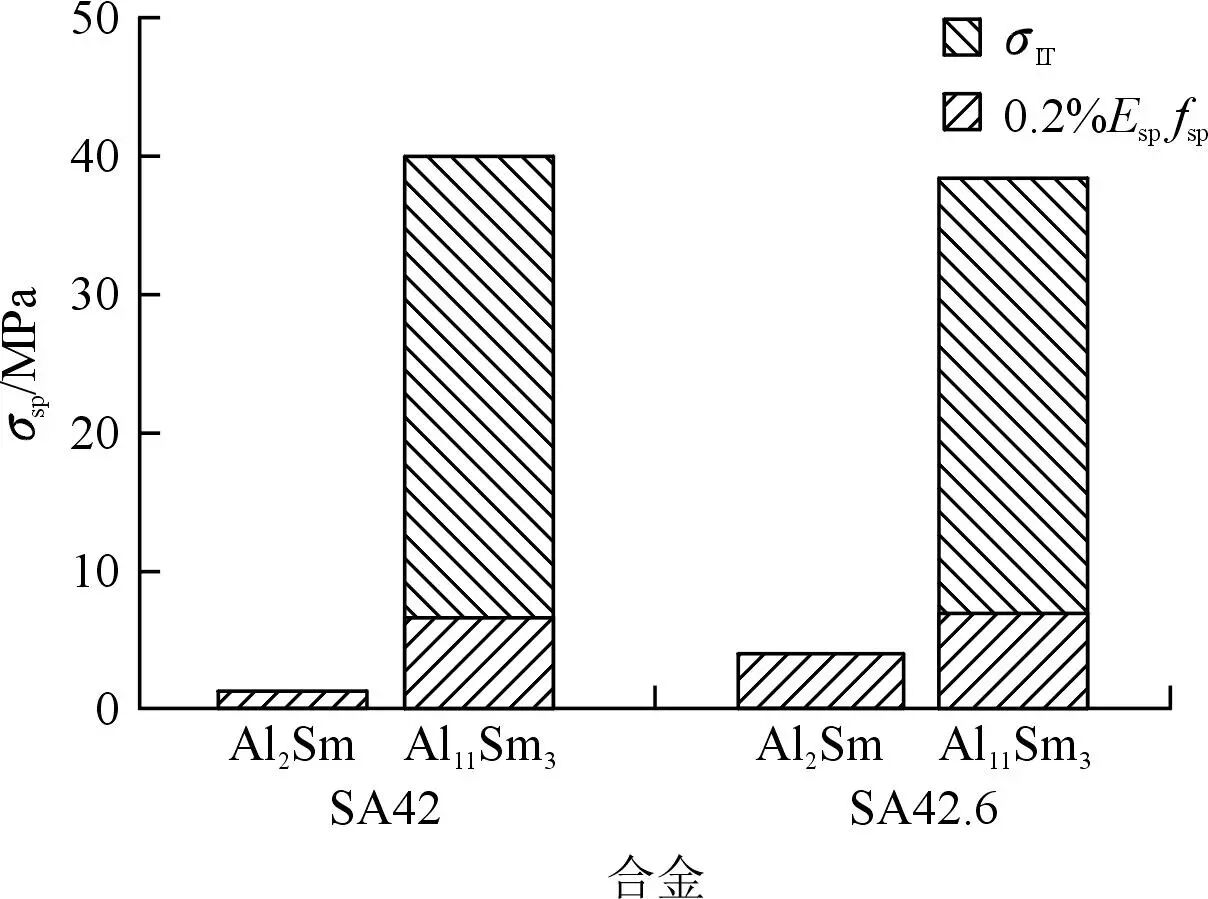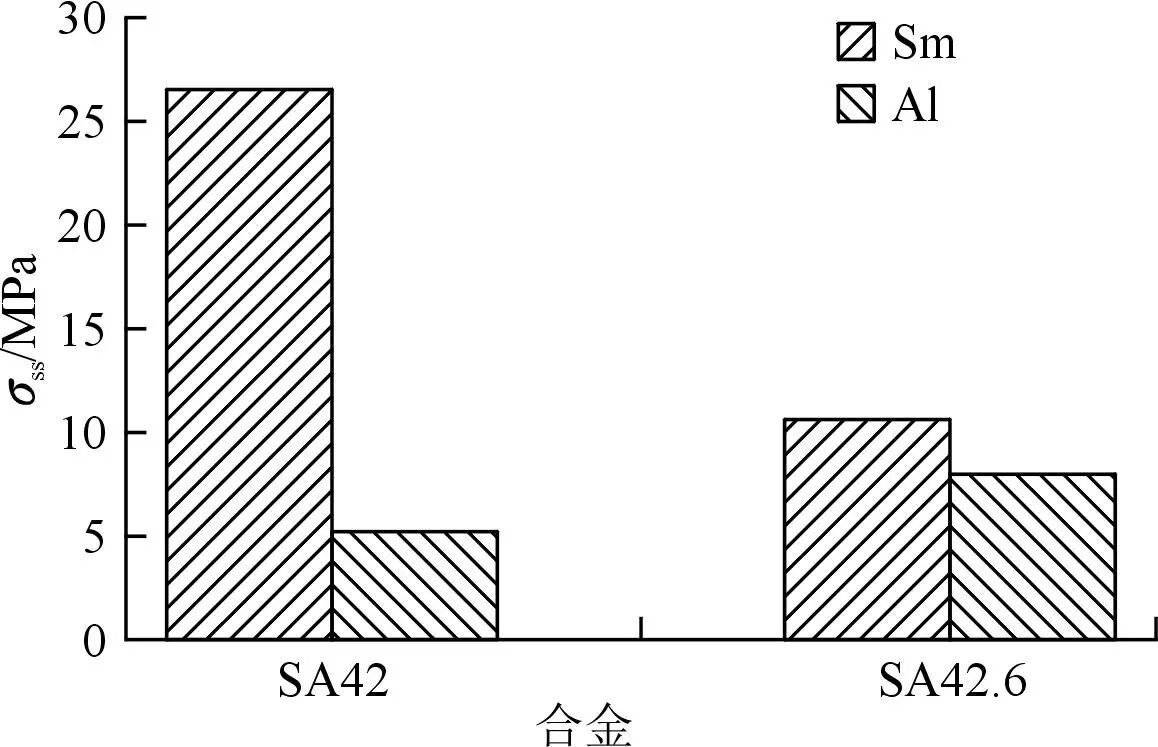 圖5 SA42和SA42.6合金的固溶強(qiáng)化效果 依據(jù)圖3a計算出兩種合金的第二相強(qiáng)化效果,見圖6。可以發(fā)現(xiàn),Al2Sm相的強(qiáng)化效果有明顯的增加,但是總體第二相強(qiáng)化效果差別不大。表3為兩種合金不同強(qiáng)化效果的差異。在SA42合金的基礎(chǔ)上增加0.6%的Al后,形成了大量的大塊Al2Sm相,一方面導(dǎo)致Sm原子的固溶強(qiáng)化效果大幅降低,而形成的Al2Sm相帶來的第二相強(qiáng)化效果又無法彌補(bǔ)固溶強(qiáng)化的缺失;另一方面,壓鑄工藝制備的合金晶粒尺寸較細(xì)小,Al2Sm顆粒不會產(chǎn)生顯著的異質(zhì)形核效果,導(dǎo)致SA42.6合金的屈服強(qiáng)度比SA42合金低了近20 MPa。