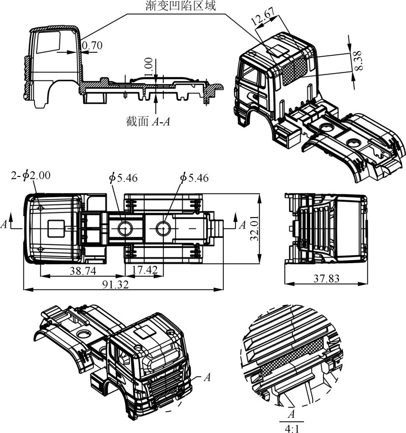 ![]() 原標題:鋅合金薄壁件壓鑄模具失效分析及設計優化 某鋅合金鑄件年需求110萬件,要求其成形模具除日常維護保養外需要白夜班連續壓鑄生產,因此對模具成形的穩定性和鑄件成品率帶來挑戰。此前,企業開發過一套一模出一穴、型芯鋼料為W1.2344、設計壽命為50萬模次的模具,但模具成形約30萬次后,鑄件表面出現嚴重披鋒及氣泡缺陷,且型芯發生局部斷裂,難以滿足生產需求。通過更換綜合性能更優的ASSAB 8407 Supreme電渣重熔鋼作為型芯材料,同時沿用一模出一穴的成形方案以期提高鑄件的良品率和模具壽命,但模具在投入生產并成形約17萬模次后同樣出現了型芯斷裂失效和氣泡披鋒缺陷。相比其設計壽命及此前開發的一套模具的使用壽命,斷裂情形屬于模具早期失效,給企業的生產效率和經濟效益造成了較大損失。為徹底解決模具成形穩定性差、壽命短及為同類型薄壁鑄件的壓鑄模具成形方式和失效改善提供參考,對失效模具進行分析和優化,旨在為相關產品生產提供參考。 圖文結果 圖1為某款重載卡車的比例模型,材料為鑄造鋅合金ZZnA14Y,輪廓尺寸為91.32 mm×32.01 mm× 37.83 mm,壁厚為1 mm,壁薄且結構復雜;鑄件頂部有兩個?2 mm的裝配孔(簡稱頂部裝配孔);前端有一個長方形通槽孔特征(見圖1中截面A-A網格陰影區域,簡稱前端通槽孔)。鑄件需具備兩種不同外形設計,即一種有頂部裝配孔及前端通槽孔,另一種無孔槽特征。兩種設計方案中,兩處的孔和槽特征分別通過模具上的互換鑲針和互換側向抽芯滑塊來實現切換。鑄件外觀需進行液體靜電噴涂工序(油漆烘烤固化溫度為130~140 ℃)后流入移印裝飾工序,鑄件表面要求無冷紋、冷隔、縮孔及其他壓鑄填充缺陷且氣泡率≤3%。