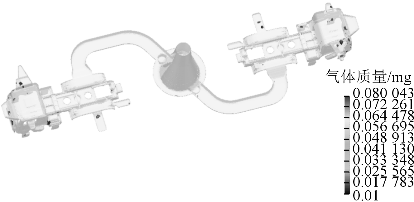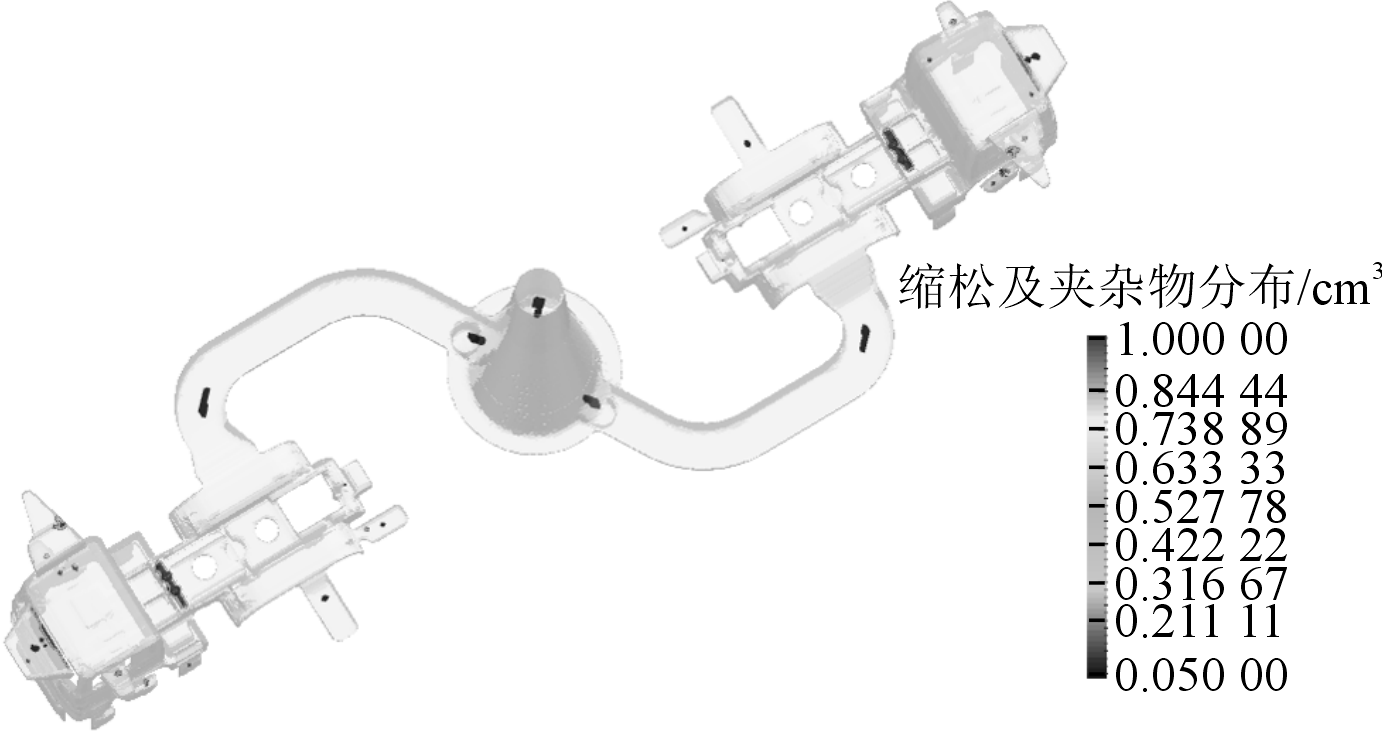 圖9 末端填充路徑分析(時間為0.021 53 s) 針對壁厚設計缺陷,從圖1截面A-A可以看到此漸變凹陷區域在鑄件上起外觀裝飾作用,因此為消除因壁厚設計不合理造成的填充缺陷,在確保外觀效果前提下壁厚加厚至0.7 mm;同時將澆口套的澆口尺寸由?8 mm增至?10 mm,內澆口厚度由0.5 mm增至0.6 mm,內澆口兩側起模斜度由25°增至40°,以改善熔體流動性;在鑄件頂部兩側增加排溢排氣渣包并優化渣包為階梯排溢系統,即將渣包設計成階梯形,厚度分別設置為5、1、0.3 mm。圖10為5%范圍內的縮松和夾雜分布。通過對改善后的一模兩腔方案模擬分析發現,鑄件中僅有微量縮松和氧化物集中在渣包中,少部分處于鑄件壁厚轉角及加強筋相交區域,對鑄件外觀質量和氣泡率不會產生實質影響。圖11為0.01 mg氣體含量分布模擬。可以看出,僅在渣包中發現有小于0.01 mg的微量氣體殘留,幾乎可以忽略不計,整體成形方案優于一模一腔失效模具方案。