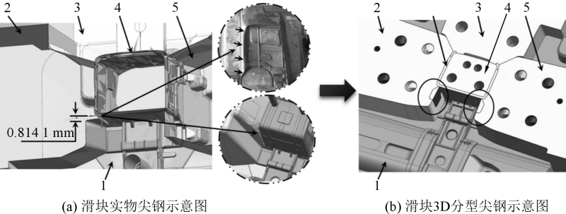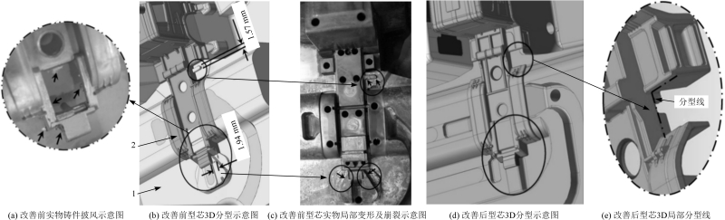 圖11 0.01 mg氣體質量分布 型芯斷裂失效是本套模具的主要失效形式。此外,鑄件在模具上分型設計的合理性對鑄件表面質量、模具強度、模具維護維修及模具壽命有直接影響。為從設計階段消除分型設計引起的斷裂失效風險,檢查失效模具成形的鑄件和模具3D設計圖后發現典型分型缺陷并給出了相應優化方法。分型改善示意圖見圖12~圖14。鑄件頂部兩側轉角由滑塊1、滑塊3與型腔結合部位成形的區域在兩滑塊上存在32.18°尖角,容易因合模時的壓力接觸導致滑塊局部變形或崩裂從而造成鑄件出現披鋒或多料。改善后分型將尖角區域加大至80°以減小局部接觸應力、避免滑塊局部變形及崩裂。