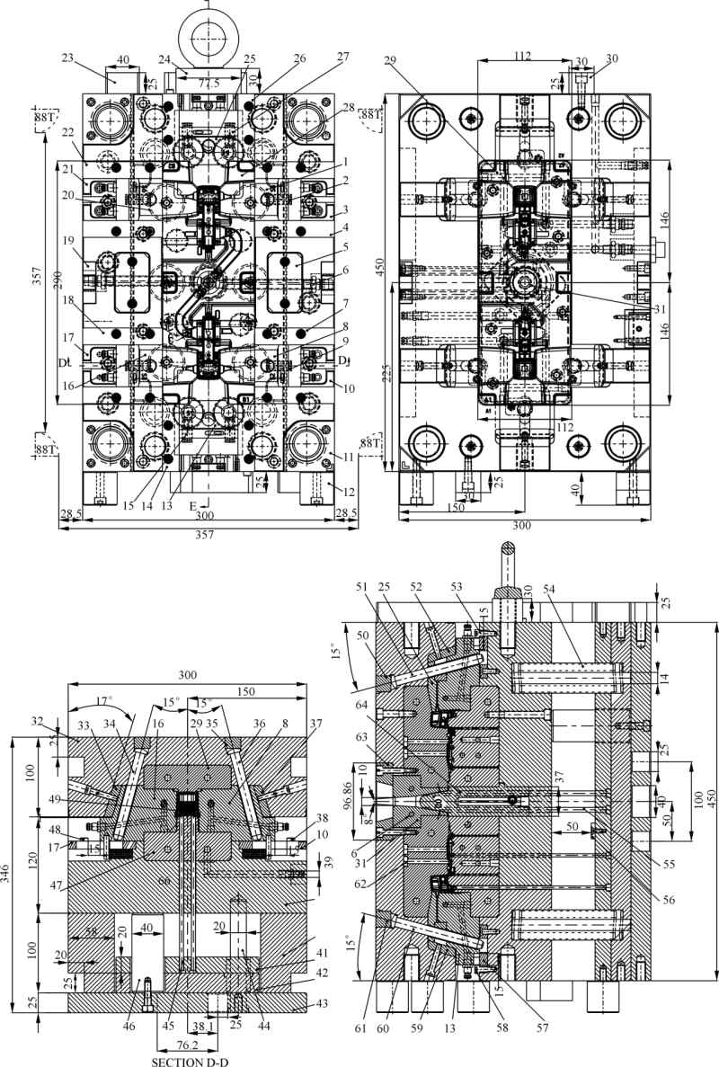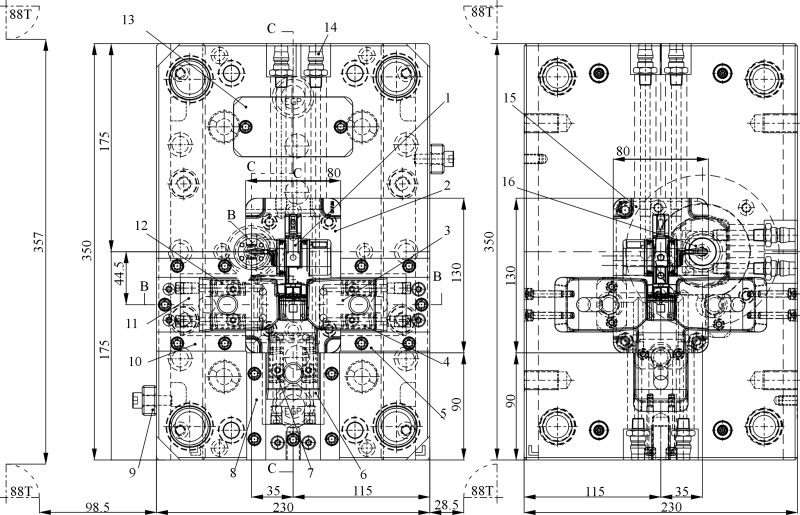 圖16 改善后的模具溫度控制示意圖 結論 (1)失效模具成形零件硬度偏高、脆性大,角位過渡圓角無法有效減小因加工和高溫熔體沖擊造成的應力集中;電火花加工殘留變質白層上所附著的微裂紋形成斷裂源,在內、外應力作用下引起斷裂;鑄件在模具長寬方向大尺寸偏心放置設計降低了模胚和機器利用率,加速了模具導向定位和頂出系統磨損,間接誘發模具早期失效;鑄件局部壁厚突變加大了熔體填充阻力和卷氣夾雜風險。 (2)鑄件局部孔槽特征發生變化,熔體填充路徑和填充結果隨之發生明顯改變;對于主體形狀相同而局部孔槽特征不同且差異較大的兩種或多種設計,盡量避免通過在同一套模具上設計互換鑲件或互換抽芯滑塊的方式來實現方案之間的切換,以平衡不同方案之間的熔體填充效果,確保穩定的鑄件外觀質量。 (3)分型設計不合理導致成形零件局部變形和崩裂,引起鑄件披鋒和多料而需增加二次返工工序,影響生產成本和效率;優化模具加工和壓鑄工藝可顯著延長模具壽命和提高鑄件質量穩定性。 《鋅合金薄壁件壓鑄模具失效分析及設計優化》