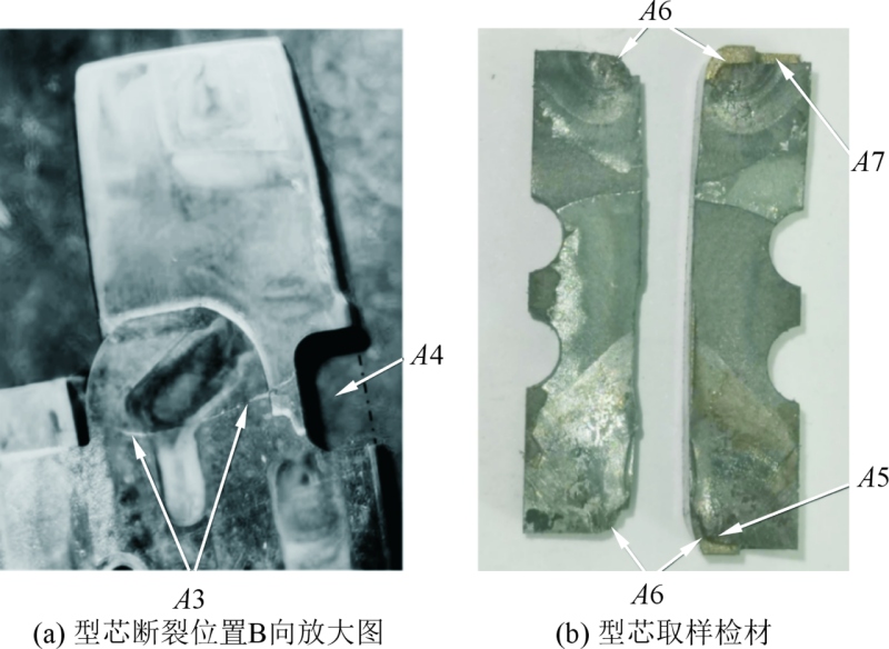 圖2 型芯斷裂位置及形貌示意圖(A1.裂紋位置;A2.主斷裂紋)