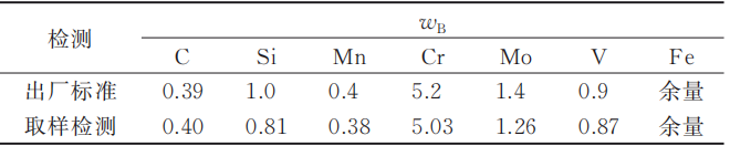圖3 取樣位置及斷裂形貌示意圖(A3.側斷裂紋;A4.取樣位置;A5.金相觀察位置;A6.裂紋源;A7.殘留電火花紋) 表1 失效模具型芯化學成分(%)