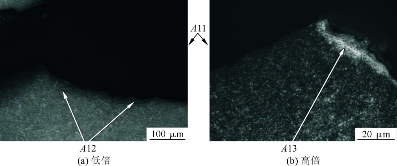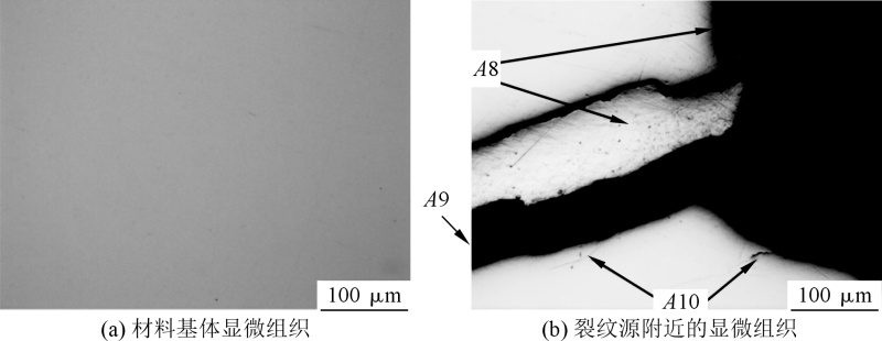 圖4 材料基體及裂紋源附近的拋光形貌(A8凝固Zn合金A9主裂紋A10微裂紋)