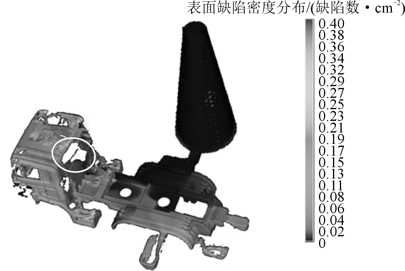 圖7 填充節點表面缺陷分析 失效模具在壓鑄過程中和舊模具一樣存在氣泡及披鋒缺陷,考慮熔體填充過程可能不穩定及成形零件存在分型不合理的情況,對分型缺陷進行分析改進。通過FLOW-3D軟件對鑄件填充過程和卷氣夾渣等缺陷進行分析,模擬結果見圖7~圖9。