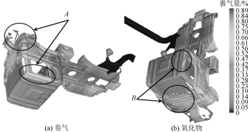 圖8 填充過程卷氣及氧化物分析(A,B分別為卷氣及氧化物聚集區,時間為0.020 53 s)