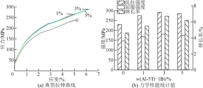 圖11 不同Al-5Ti-1B添加量時(shí)TiB2/ADC12鋁合金的力學(xué)性能