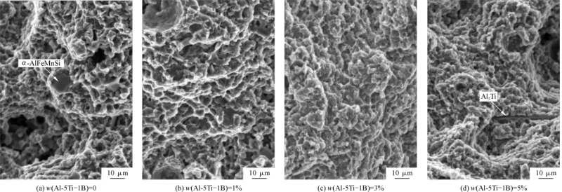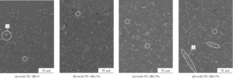 圖7 不同Al-5Ti-1B含量的TiB2/ADC12鋁合金SEM形貌