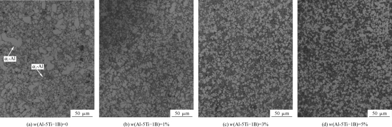 圖5 不同Al-5Ti-1B含量的TiB2/ADC12鋁合金的金相照片
